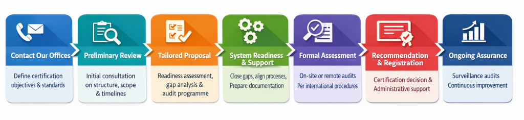 7. Ongoing assurance: After certification, we support you through surveillance audits, continuous improvement reviews, and system updates to ensure sustained compliance and long-term excellence, consistent with global best practices.